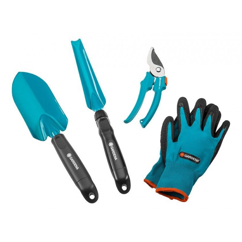 Composé de : 1 sécateur réf. 8754. 1 paire de gants réf. 206-20. 1 transplantoir réf. 8950. 1 couteau désherbeur réf. 8735