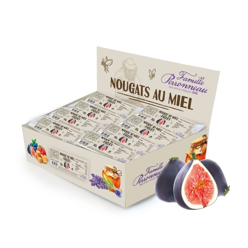 Figues confites 27% (figues, sirop de glucose, sucre), sucre, amandes blanchies 18% origine Méditerranéenne, miel 15%, sirop de glucose (blé garanti sans gluten), sucre glace, blanc d??uf, pistaches 1,2% origine Méditerranéenne, pain azyme (fécule de pomme de terre, eau), extrait de vanille.