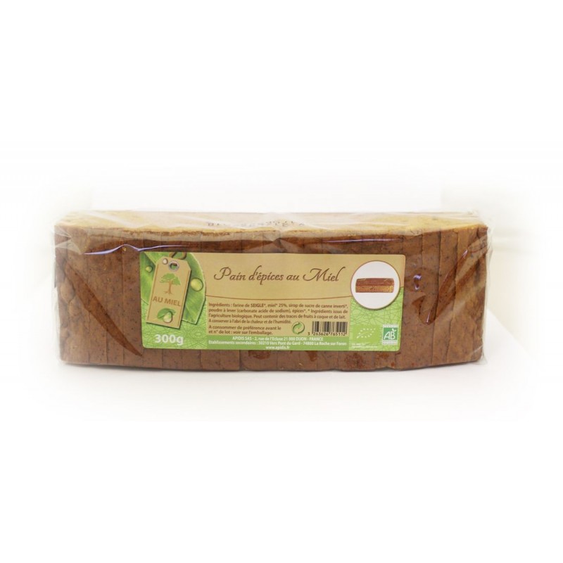 Farine de seigle (*)(*), sirop de sucre de canne inverti(*) inverti(*), miel 25%, poudre à lever (carbonate acide de sodium), épices(*)(*) Ingrédients issus de l?agriculture biologique.