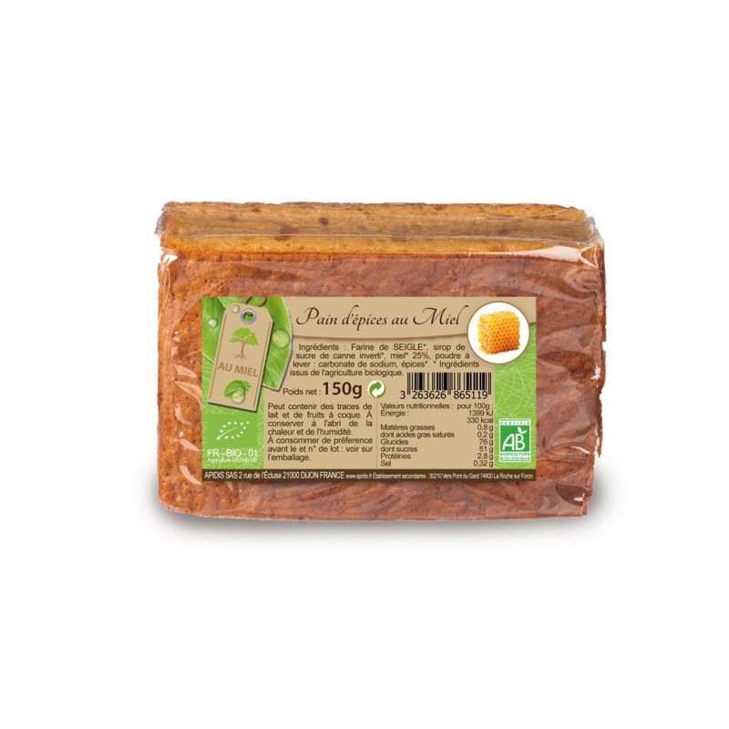 Farine de seigle(*), sirop de sucre de canne inverti(*), miel(*) 25 %, poudre à lever (carbonate acide de sodium), épices(*).(*) Ingrédients issus de l?agriculture biologique.